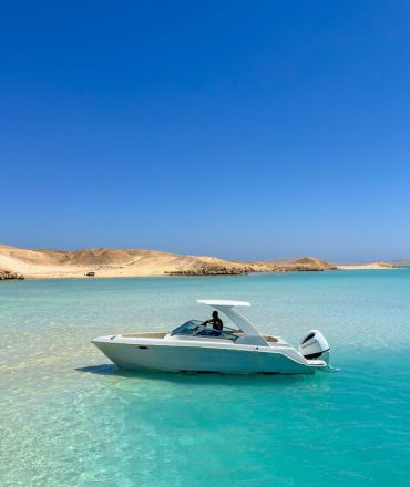 Ägypten Urlaub, Motorboot am Holzsteg vor türkisblauem Meer und Wüstenhügeln – Ägypten Urlaub in Hurghada