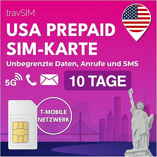Die USA SIM Karte hat unbegrenzte Daten. Sie können diese Daten in allen 50 Staaten (außer Alaska) nutzen. Sie können bis zu 7 GB nutzen, um andere Geräte mit 3G-Geschwindigkeit zu hotspotten. Die SIM Karte USA nutzt das T-Mobile-Netz. Die SIM USA wird mit einer amerikanischen Telefonnummer geliefert, mit der Sie unbegrenzt in die USA telefonieren und simsen können, während Sie sich in den USA aufhalten. Kostenlose eingehende Anrufe. Der Plan auf der USA SIM Card ist für 10 Tage gültig. Bitte senden Sie eine Aktivierungsanfrage einen Tag vor dem gewünschten Starttermin. Ihre USA SIM wird in der Pacific Standard […]