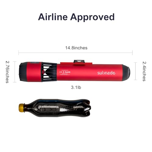 - ✈️【KOMPAKT & TRAGBAR】Mit einer Größe von 14,84*2,75*2,75 Zoll und einem Gewicht von nur 3 Pfund ist der Subnado-Unterwasserscooter etwa so groß wie eine kleine Limonadenflasche. Ihr Subnado begleitet Sie überall hin, bequem in Ihrem Handgepäck, mit einem von der Fluggesellschaft zugelassenen 98-Wh-Akku, der Ihrer Unterwasserreise noch mehr Spaß macht. (Überprüfen Sie vor dem Flug die Regeln der Fluggesellschaft und des Flughafens, da verschiedene Fluggesellschaften und Flughäfen möglicherweise unterschiedliche Vorschriften haben.)